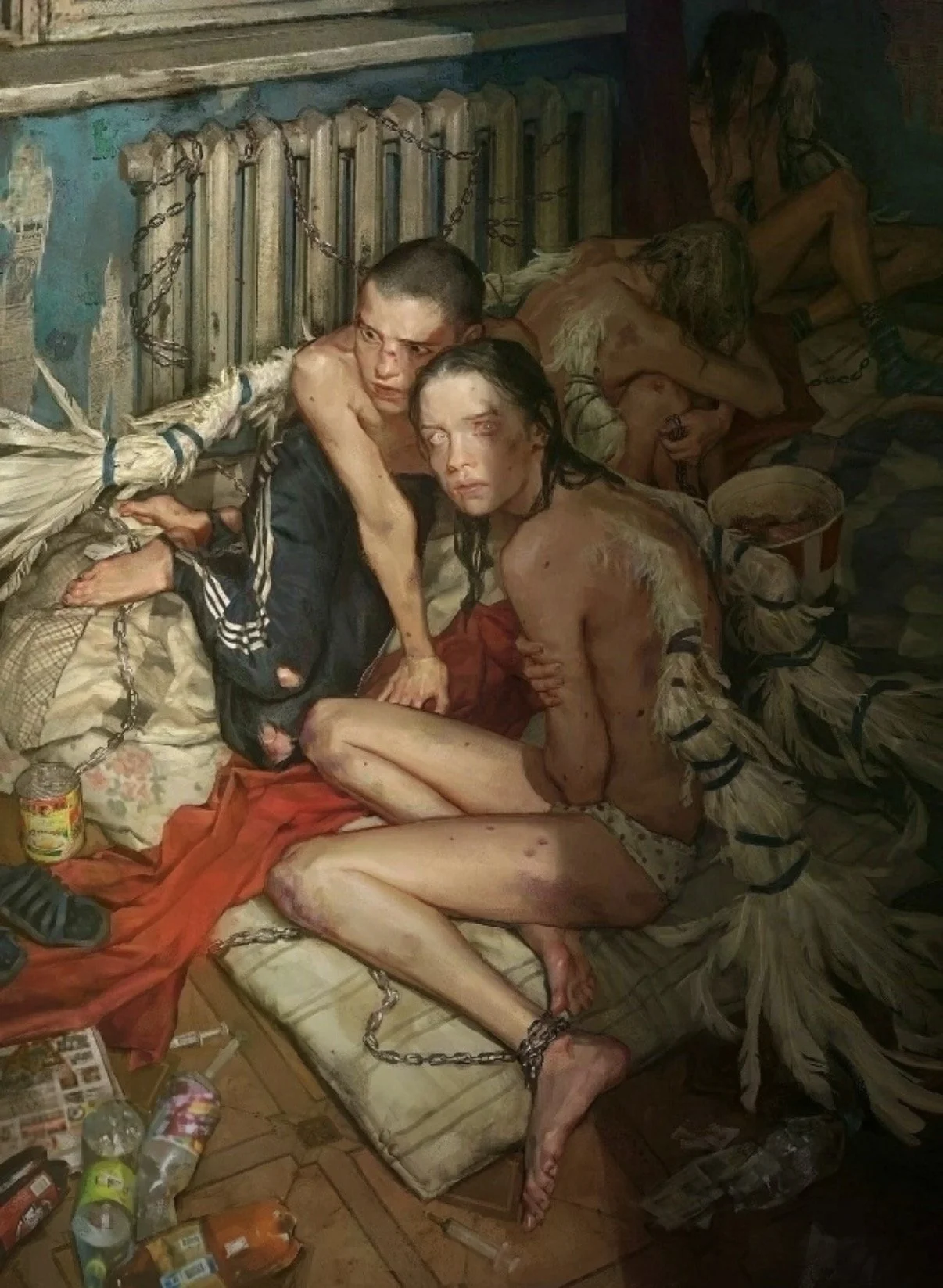 We are preparing a complex and deep art project in the Dark Art / Grunge genre. Our goal is to recreate a painting full of symbolism: the contrast between celestial purity and the harsh, dirty reality of existence.